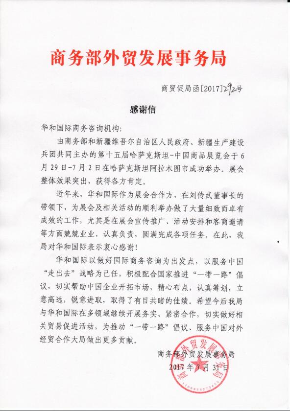 商务部外贸发展事务局发来感谢信!